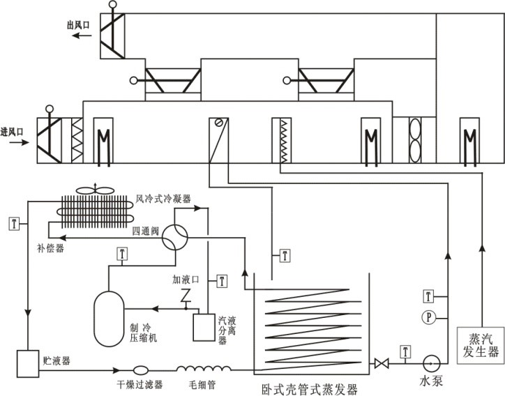 綜合性;采用國(guó)內(nèi)先進(jìn)的二次回風(fēng)系統(tǒng),在同一臺(tái)實(shí)驗(yàn)臺(tái)上完整的完成8種制冷系統(tǒng)工況