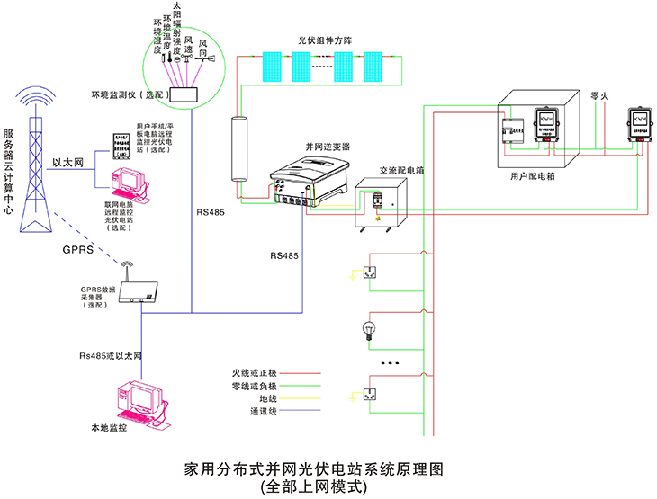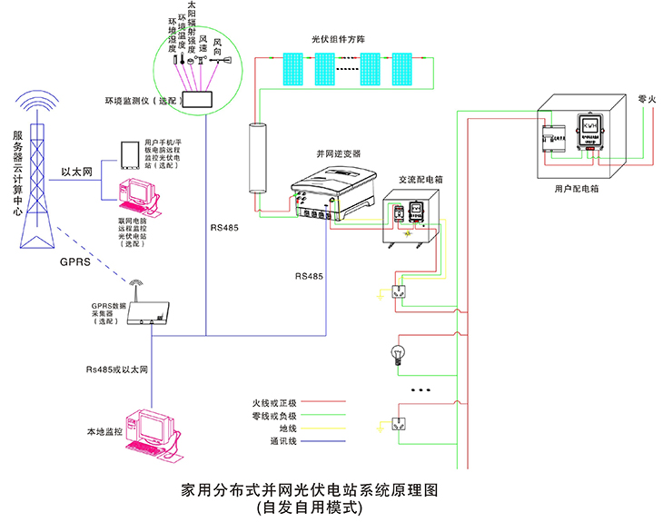 在晴朗的白天,裝在屋頂上的光伏組件發出的直流電經過并網逆變器逆變成與電網同頻率同相位的單相交流電給負載進行供電,在夜晚或陰雨天等太陽光照不足的情況下,系統處于待機狀態,負載用電全部來自電網。您可以通過系統監控軟件來實時查看系統的運行狀態和故障信息,或者是選配遠程通訊數據采集器,將系統工作數據通過GPRS或以太網,傳輸到您的手機、平板電腦或任意一臺聯網的電腦,以便于您遠程實時掌控電站的信息。