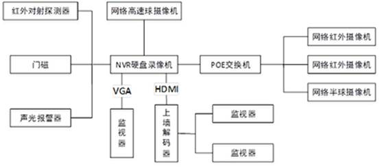 系統配置有高速球云臺攝像機、一體化槍型攝像機、紅外攝像機、室內全方位云臺、矩陣主機、彩色監視器、硬盤錄像機等器件,可進行器件的選擇、檢測和安裝。完成視頻監控系統的線路鋪設和連接。通過系統模塊的參數設置和編程,實現監視器的視頻監控、畫面切換和報警聯動錄像等功能。