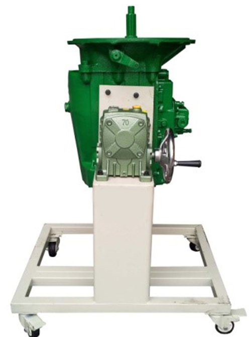 1.采用翻新天錦EQ1120GA2 8JS125TA型手動(dòng)變速器總成(附件齊全,易于拆裝),并裝在專用翻轉(zhuǎn)架上。 采用減速翻轉(zhuǎn)機(jī)構(gòu),可使變速器旋轉(zhuǎn)任意角度,并能任意位置鎖止,便于學(xué)生從不同的角度進(jìn)行拆卸和裝配。
