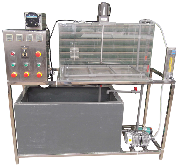 反應池、曝氣頭、抽吸泵、氣泵、水泵、流量計、配水箱、穿孔曝氣器、不銹鋼可移動框架、控制屏。