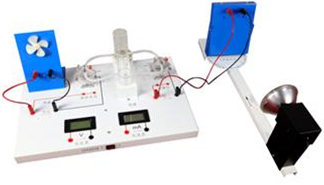 燃料電池教具是利用光線照射在太陽能電池板上產生電能,然后利用產生的電能作用在電解電池模塊上,使水發生電解產生氫氣和氧氣。氫氣和氧氣進入到發電模塊產生電能,帶動風扇轉動。
