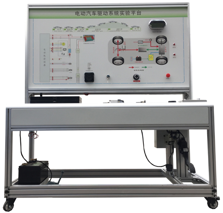 檢測控制面板(裝有各種檢測端子,1448×940mm彩色電路圖和工作原理示意圖)、組合儀表、點火開關、電機控制器、車載充電器與充電接口、DC-DC轉換器、鋰動力電池組、電動車電機(直流無刷電機)與變速箱、后輪左右液壓制動裝置、驅動橋傳動裝置、剎車開關、檔位開關、油門控制裝置、大電流繼電器、電源總開關、急停開關、輔助蓄電池(12V45AH)、一體化全鋁合金型材搭建的移動臺架(1500×700×1700mm (帶自鎖腳輪裝置,帶安裝檢測端子的原理面板,面板1448×940mm)、故障考核系統、設備操作說明書。