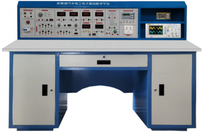 采用鐵質雙層亞光噴塑結構,右邊是儀器存放格。桌子中間是抽屜,放置常用工具,桌子下部左右是元件儲存柜,放置實驗元器件。桌中央配置通用九孔電路板(尺寸:35×30cm ),根據實驗電路在其上任意拼插元件盒成實驗電路,元件盒盒體透明直觀,內裝元件一目了然,盒蓋印有永不褪色元件符號,盒蓋與盒體結合采用較科學的壓卡式結構,維修拆裝方便。每張臺桌配有一粒膠皮板,保護通用底板與桌面(如需在桌上放置工具、焊接等)。