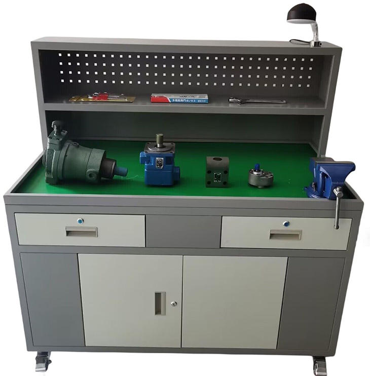 6、實訓臺:采用鈑金結(jié)構(gòu)設(shè)計,表面為雙層亞光密紋噴塑工藝處理,臺面采用下凹設(shè)計,增加臺虎鉗,以及絕緣防滑墊,同時為液壓閥拆裝時提供一個良好的接油、防震平臺。